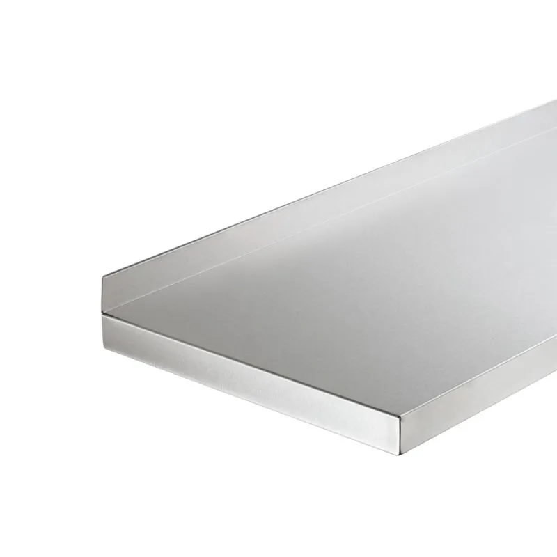 Ausführung: Glattes Edelstahlblech, vorne und seitlich um 40 mm abgekantet und gefalzt, Rückseite um 40 mm aufgekantet und gefalzt. Ecken verschweißt/geschliffen.