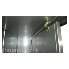 3-seitig geschlossen, frontseitig mit doppelwandigen Schiebtüren sowie abgekanteter, umgeschlagener Griffleiste. Der durchgehende Schrankraum ist mit einem höhenverstellbaren Zwischenboden ausgestattet. Wandbefestigungswinkel für die bauseitige Montage sind inklusive (ohne Schrauben oder Dübel). Die Haltebefestigungswinkel bestehen aus belastbarem und besonders stabilem 2 mm Edelstahlblech.