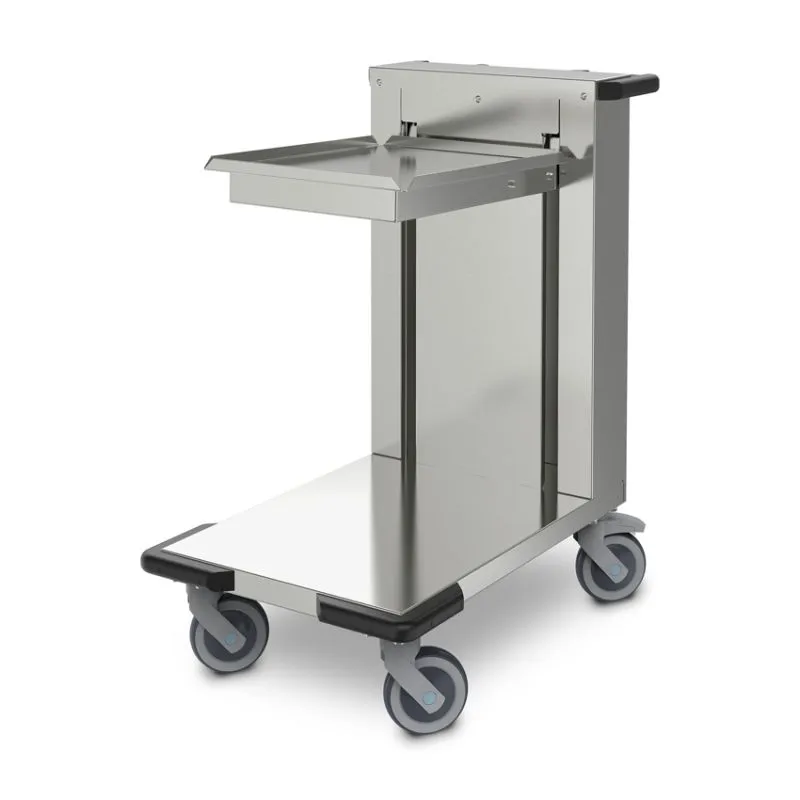 Stapler in selbsttragender und hygienischer Konstruktion aus hochwertigem Edelstahl. Geschlossenes Bodenblech mit allseitiger Abkantung. Darauf aufgebaut ein geschlossener Federkasten mit einer an Federn aufgehängten, geschlossenen Plattform mit umlaufender Aufkantung und kugelgelagerter Plattformführung. Gleichbleibende Ausgabehöhe durch manuell einstellbares Zugfedersystem aus Edelstahl.