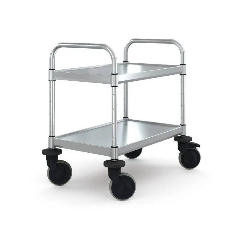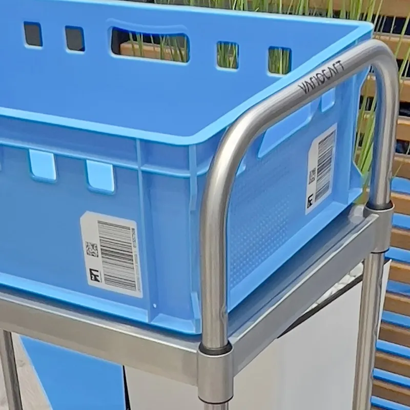 Der stabile Edelstahl Servier- und Transportwagen ist mit zwei schallgedämmten, im Raster von 66,5 mm höhenverstellbaren Borden ausgestattet. Die Bordmaße von 600x400 mm sind speziell optimiert für Euro-Behälter im Format 400x600 mm oder Getränkekisten. Die maximale Bordlast beträgt 40 kg, die Gesamtnutzlast bis zu 80 kg. Das Eigengewicht liegt bei nur 6 kg.