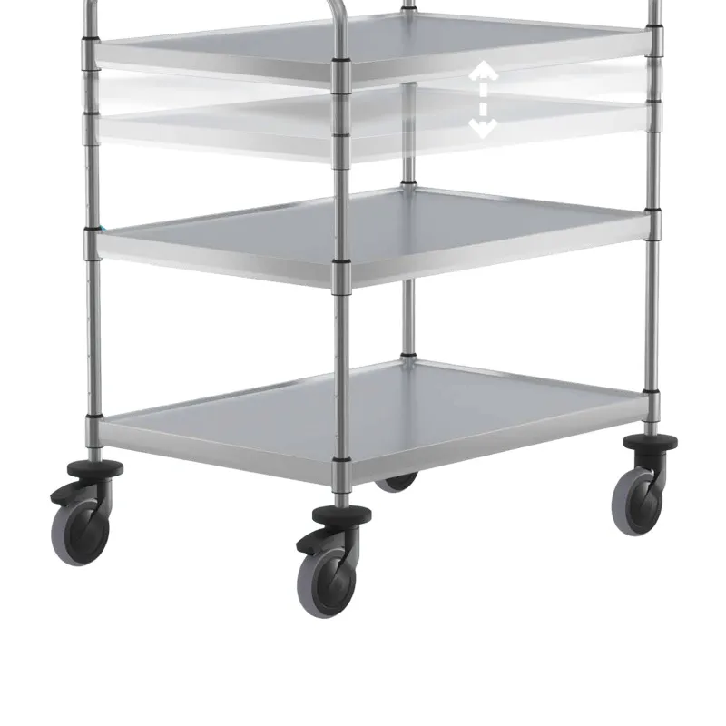 Der stabile Edelstahl Servier- und Transportwagen ist mit vier schallgedämmten, im Raster von 66,5 mm höhenverstellbaren Borden ausgestattet. Die Bordmaße von 800x600 mm sind speziell optimiert für Euro-Behälter im Format 400x600 mm oder Getränkekisten. Die maximale Bordlast beträgt 60 kg, die Gesamtnutzlast bis zu 300 kg. Das Eigengewicht liegt bei nur 23 kg.