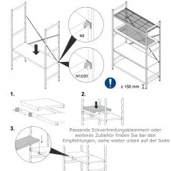 Regalständer aus zwei Vierkantrohren, 25x25 mm, verpresst, mit stabilisierenden querlaufenden Rechteckrohren, 40x7 mm. Hygienische Abdichtung mittels höhenverstellbaren Schraubfüßen, Verstellbarkeit 25 mm, oberen Abschlusskappen, aus Kunststoff. Höhenraster 150 mm.