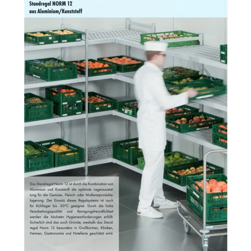 Dauerhafter Einsatz der Regale bei Belastungsgrenzwerten im Temperaturbereich von -30°C bis +60°C möglich. Regalsystem Norm 12 und Norm 20 können kombiniert werden ! Vorgesehen und optimal geeignet für die Verwendung in Kühl- und Tiefkühlraumen, im Medizinbereich, Hygiene- und Sterilabteilungen oder in der Lebensmittelmittelverarbeitung. Ebenso einsetzbar im Lagerbereich, insbesondere bei der Trocken- und Konservenlagerung, Wäschebevorratung oder im Medizin-, Klinik- oder Pharmabereich. Lieferung im zerlegtem Zustand, Montage bauseits.