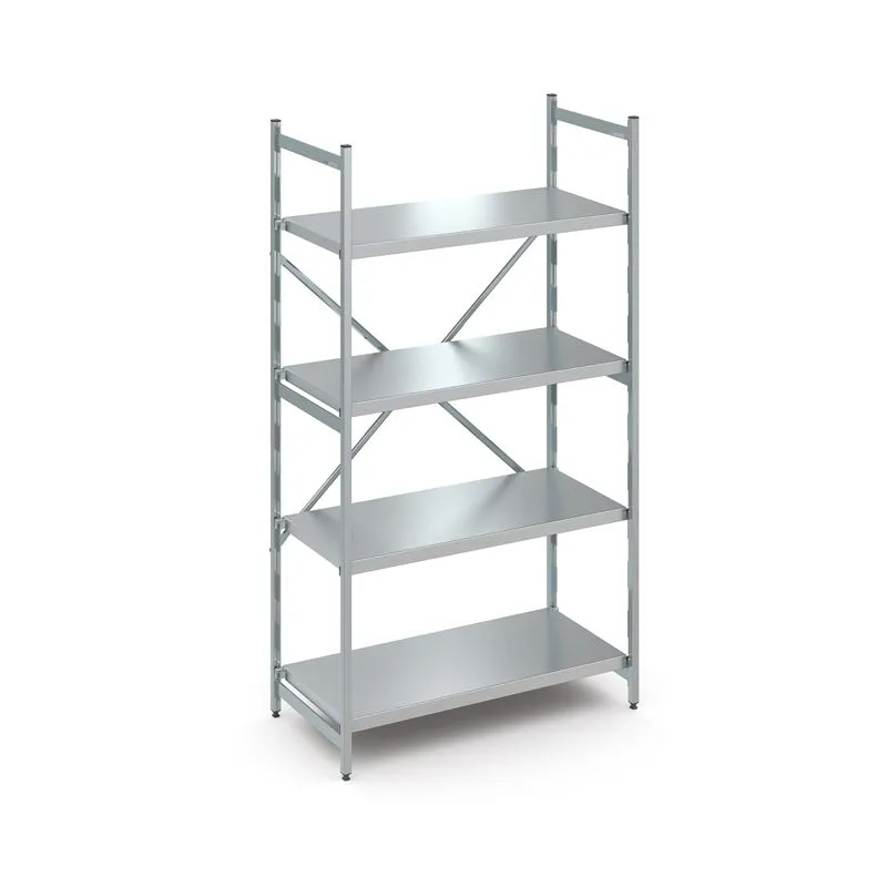 Regalständer aus Spezial-Vierkantrohren 25 x 25 mm, verbunden und stabilisiert durch fest verpresste quer laufende Ständersprossen 40 x 7 mm. Obere Abdeckkappen aus Kunststoff und höhenverstellbare Schraubfüße zum Ausgleich von Bodenunebenheiten bis zu 25 mm als hygienischer Abschluss des Regalständers. Integrierte Auflagelaschen im Abstand 150 mm zum leichten Einhängen der Regalauflagen.