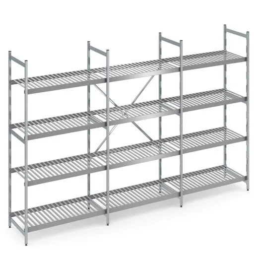Ausführung: Modulares System aus Aluminium und Aluminium Rostauflagen. Breite beliebig anbaubar, Übereckbau möglich, ohne Werkzeug montierbar. Werkstoffe, Hygiene und Bauweise gemäß DIN 18868-2. Die Auflagentiefe ist um ca. 50 mm geringer als die angegebene Regaltiefe. Feldlast: 600 kg Bei Übereckbau beträgt die Fachlast der tragenden Auflage 70% vom Normalwert.