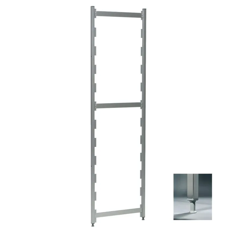 Regalständer aus Spezial-Vierkantrohren 25 x 25 mm, verbunden und stabilisiert durch fest verpresste quer laufende Ständersprossen 40 x 7 mm. Obere Abdeckkappen aus Kunststoff und höhenverstellbare Schraubfüße zum Ausgleich von Bodenunebenheiten bis zu 25 mm als hygienischer Abschluss des Regalständers. Integrierte Auflagelaschen im Abstand 150 mm zum leichten Einhängen der Regalauflagen.