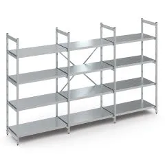Regalständer aus zwei Vierkantrohren, 25x25 mm, verpresst, mit stabilisierenden querlaufenden Flachprofilen, 50x2 mm. Hygienische Abdichtung mittels höhenverstellbaren Schraubfüßen, Verstellbarkeit 25 mm, oberen Abschlusskappen, aus Kunststoff. Das Höhenraster für die Regalauflagen beträgt 150 mm.