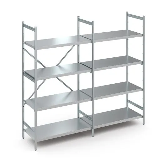 Regalständer aus zwei Vierkantrohren, 25x25 mm, verpresst, mit stabilisierenden querlaufenden Flachprofilen, 50x2 mm. Hygienische Abdichtung mittels höhenverstellbaren Schraubfüßen, Verstellbarkeit 25 mm, oberen Abschlusskappen, aus Kunststoff. Das Höhenraster für die Regalauflagen beträgt 150 mm.