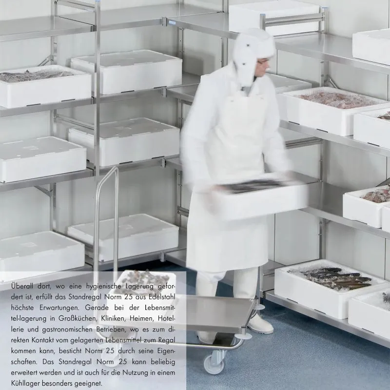 In dem Regal wird unter anderem der hochwertige Edelstahl 1.4509 mit Chrom und Titananteil verwendet. Dieser Edelstahl findet häufig Anwendung in Produkten wie Waschmaschinen und Abgasanlagen von Fahrzeugen. Hinsichtlich seiner Rostbeständigkeit steht er dem weit verbreiteten Chrom-Nickel-Stahl (1.4301) in nichts nach, lediglich seine Magnetismus-Eigenschaft unterscheidet ihn. Regale der Serien Norm-5 und Norm-25 können beliebig miteinander kombiniert werden. Die Lieferung erfolgt im zerlegtem Zustand.