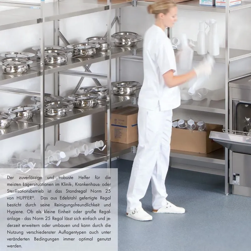 In dem Regal wird unter anderem der hochwertige Edelstahl 1.4509 mit Chrom und Titananteil verwendet. Dieser Edelstahl findet häufig Anwendung in Produkten wie Waschmaschinen und Abgasanlagen von Fahrzeugen. Hinsichtlich seiner Rostbeständigkeit steht er dem weit verbreiteten Chrom-Nickel-Stahl (1.4301) in nichts nach, lediglich seine Magnetismus-Eigenschaft unterscheidet ihn. Regale der Serien Norm-5 und Norm-25 können beliebig miteinander kombiniert werden. Die Lieferung erfolgt im zerlegtem Zustand.