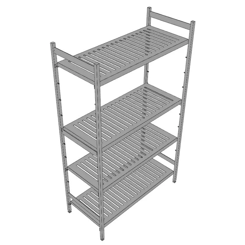 Edelstahl Blechrost-Regalauflagen aus 0,8 mm starkem Blech, leicht zu reinigen, Höhenverstellbarkeit ohne Werkzeug. Längsseitig um 40 mm, stirnseitig um 30 mm abgekantet und nach innen gefalzt, für eine optimale Stabilität und Hygiene. Tiefgepresste, ca. 32 mm breite Schlitze im Abstand 50 mm.
