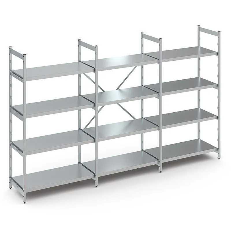 Regalständer aus Vierkantrohren 30 × 30 mm, verbunden durch fest eingeschweißte Ständersprossen aus Flachprofil 60 × 4,0 mm, die auch als fixe Einhängemöglichkeiten für Regalauflagen dienen. Weitere Einhängemöglichkeiten durch fest an die Regalständer angeschweißte Auflagelaschen im 150 mm-Raster, in die zwei lose mitgelieferte Einhängeverbindungen pro Regalständer variabel eingehängt werden können. Obere Abdeckkappen aus Kunststoff und höhenverstellbare Aluminium-Schraubfüße zum Ausgleich von Bodenunebenheiten bis zu 25 mm als hygienischer Abschluss des Regalständers.