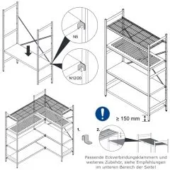 Regalständer aus zwei Vierkantrohren, 25x25 mm, verpresst, mit stabilisierenden querlaufenden Flachprofilen, 50x2 mm. Hygienische Abdichtung mittels höhenverstellbaren Schraubfüßen, Verstellbarkeit 25 mm, oberen Abschlusskappen, aus Kunststoff. Verschweißte Rundbolzen, Ø 7 mm, als Auflagepunkte. Das Höhenraster für die Regalauflagen beträgt 150 mm.