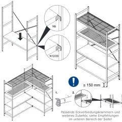 Dank seiner Blechrost Regalauflagen und seines Temperaturbereichs von -40°C bis +60°C ist das Regal äußerst flexibel einsetzbar und passt sich perfekt an die Anforderungen Ihres Betriebs an. Die Möglichkeit des Anbaus und der Erweiterung des Regals bietet Ihnen zusätzliche Flexibilität bei der Gestaltung Ihres Lagers oder Ihrer Kühlräume. Der Eckanbau ist ebenfalls möglich und erleichtert die Ausnutzung von Ecken.