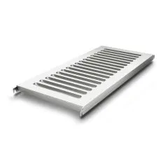 Edelstahl Blechrost-Regalauflagen aus 0,8 mm starkem Blech, leicht zu reinigen, Höhenverstellbarkeit ohne Werkzeug. Längsseitig um 40 mm, stirnseitig um 30 mm abgekantet und nach innen gefalzt, für eine optimale Stabilität und Hygiene. Tiefgepresste, ca. 32 mm breite Schlitze im Abstand 50 mm.