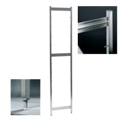 Regalständer aus zwei Vierkantrohren, 25x25 mm, verpresst, mit stabilisierenden querlaufenden Flachprofilen, 50x2 mm. Hygienische Abdichtung mittels höhenverstellbaren Schraubfüßen, Verstellbarkeit 25 mm, oberen Abschlusskappen, aus Kunststoff. Verschweißte Rundbolzen, Ø 7 mm, als Auflagepunkte. Das Höhenraster für die Regalauflagen beträgt 150 mm.