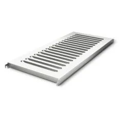 Edelstahl Blechrost-Regalauflagen aus 0,8 mm starkem Blech, leicht zu reinigen, Höhenverstellbarkeit ohne Werkzeug. Längsseitig um 40 mm, stirnseitig um 30 mm abgekantet und nach innen gefalzt, für eine optimale Stabilität und Hygiene. Tiefgepresste, ca. 32 mm breite Schlitze im Abstand 50 mm.