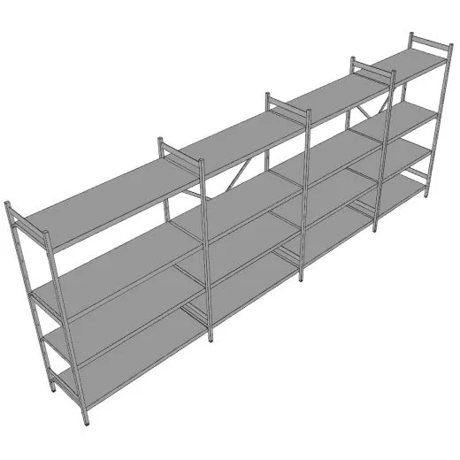Regalständer aus zwei Vierkantrohren, 25x25 mm, verpresst, mit stabilisierenden querlaufenden Flachprofilen, 50x2 mm. Hygienische Abdichtung mittels höhenverstellbaren Schraubfüßen, Verstellbarkeit 25 mm, oberen Abschlusskappen, aus Kunststoff. Das Höhenraster für die Regalauflagen beträgt 150 mm.