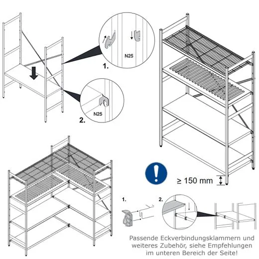 Regalständer aus zwei Vierkantrohren, 25x25 mm, verpresst, mit stabilisierenden querlaufenden Flachprofilen, 50x2 mm. Hygienische Abdichtung mittels höhenverstellbaren Schraubfüßen, Verstellbarkeit 25 mm, oberen Abschlusskappen, aus Kunststoff. Das Höhenraster für die Regalauflagen beträgt 150 mm.