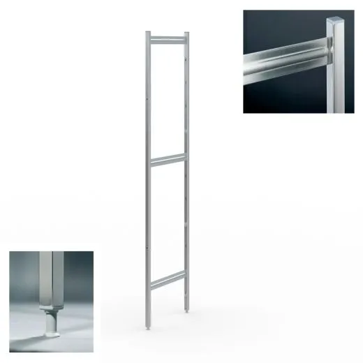 Regalständer aus zwei Vierkantrohren, 25x25 mm, verpresst, mit stabilisierenden querlaufenden Flachprofilen, 50x2 mm. Hygienische Abdichtung mittels höhenverstellbaren Schraubfüßen, Verstellbarkeit 25 mm, oberen Abschlusskappen, aus Kunststoff. Das Höhenraster für die Regalauflagen beträgt 150 mm.